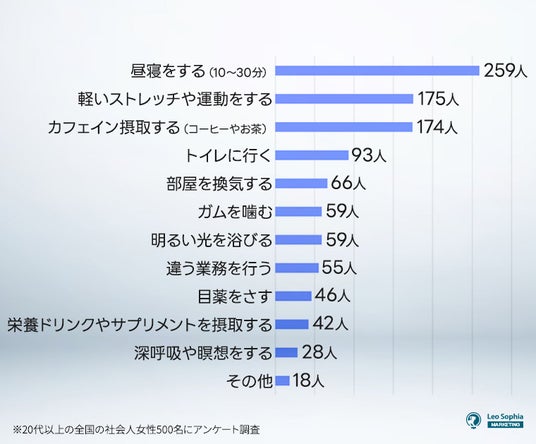 これらの結果から、仕事中の眠気対策は、身体的なリフレッシュや刺激を取り入れることが効果的であると考えられます。一方で、効果的と感じる対策は個人差が大きく、より多様な方法を試みることが重要であることも浮き彫りとなりました。