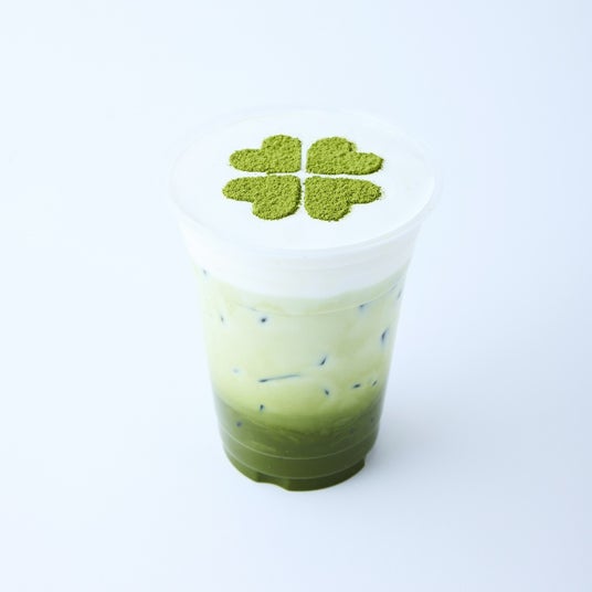 ふわ×02抹茶ラテ 550円宇治抹茶を使った抹茶ラテにふわふわのクリームを乗せました。仕上げに抹茶パウダーでクローバーの形を描いています。