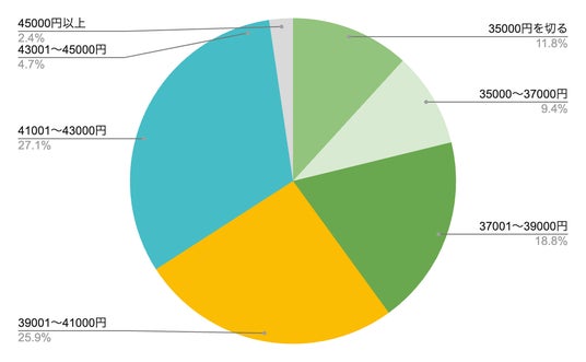 株価は「4.1~4.3万円」になると回答した人が最多で、次いで現在の水準の「3.9万円~4.1万円」と予想する人が多く、合わせて約半数を占めています。