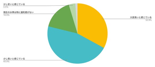 現在の物価水準について、約46%の方は「少し高いと感じている」と回答。まだまだ賃上げされていない状況では今の状況は厳しいと考えている人が多いと推察できます。