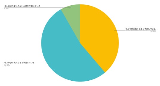 約53%の方は「今より少し高くなると予想」、次いで約39%の方は「今よりさらに高くなると予想」と回答しています。