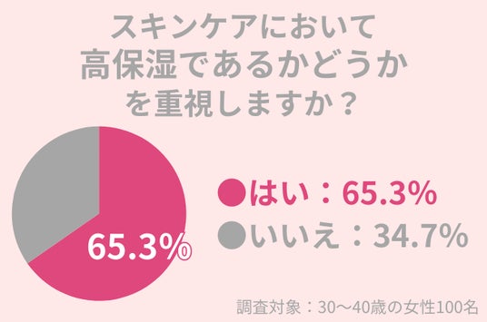 調査の結果、30代女性のうち65.3%の方が、スキンケアにおいて「高保湿であるか」を重視していることがわかりました。