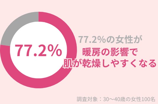 調査の結果、77.2%の30代女性がエアコン暖房の影響で肌が乾燥しやすくなるようです。冬は湿度も低く、乾燥肌が気になりやすくなります。室内に関しても、エアコン暖房を使用すると、肌が乾燥しやすくなります。エアコン暖房は水蒸気を発生させずに、直接空気を温めるため、相対湿度を著しく低下させるのです。室内でエアコン暖房を使用する際は、加湿器を使用したり、室内に濡れたタオルを干したりすることで湿度の低下を防ぎましょう。
