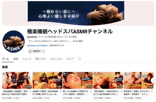 「極楽睡眠ヘッドスパASMRチャンネル」では映像と音で癒しをお届け