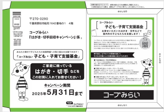 「はがき・切手回収キャンペーン」は、国内外で飢餓、貧困、格差などに苦しむ子どもたちの支援に取り組んでいる団体の支援を目的とした「コープみらい 子ども・子育て支援基金」の原資を集めるための取り組みです。店舗や宅配サービスを通じて組合員に未投函のはがきや未使用切手等の寄贈を呼びかけ、寄せられたはがきや切手を換金し、同基金の原資に充てています。