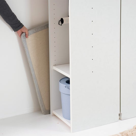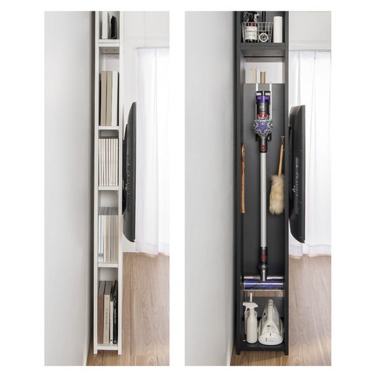 奥行き16cmタイプは本や雑誌、ルーター等を収納できます。30cmタイプには長尺の掃除用具等も収納できます。可動棚板の設置穴には市販のフックなども掛けられるので、収納物に合わせてカスタマイズできます。