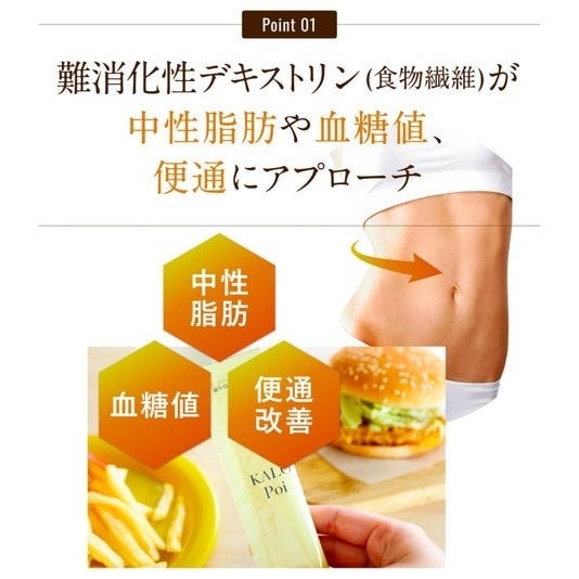 食事の糖質や脂肪の吸収を抑え、便通を整えるKALOPoi(カロポイ)食物繊維の難消化性デキストリンを5g配合。