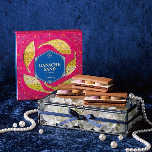 「ガナッシュサンド」はカカオニブがアクセントのガナッシュに、ISHIYAオリジナルのホワイトチョコレートと3種のフィリングを積み重ね、サクっとしたココア風味のサブレでサンドした期間限定スイーツ。こだわり抜かれた3層とバター香るサブレのマリアージュをお楽しみいただけます。