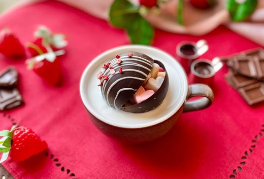 チョコボムをあつあつのミルクに溶かして飲むショコラドリンク。フランボワーズソースを入れていちごショコラとしてもお楽しみいただけます。溶けたチョコボムの中から何が出てくるかも注目を。