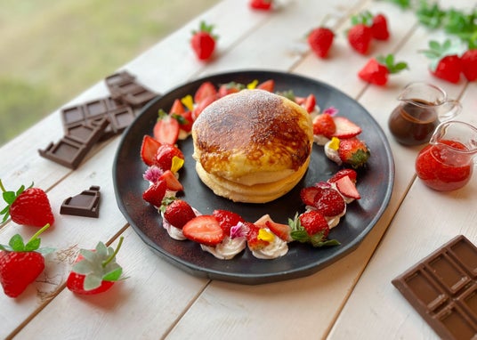 パリッとほろ苦いカスタードブリュレとふわふわのぱんケーキが相性抜群。たっぷりのいちごがまるでいちご畑のように並ぶ一皿。いちごソースチョコレートソースをかけてお召し上がりいただきます。