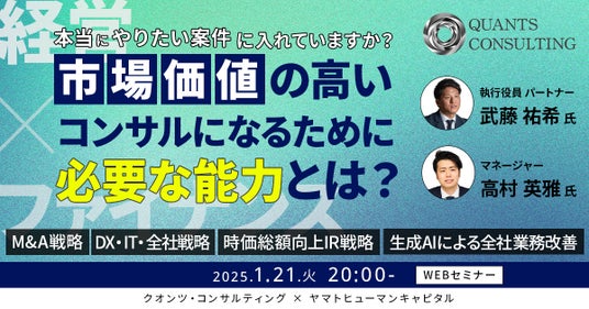 ヤマトヒューマンキャピタル株式会社(本社:東京都千代田区、代表取締役:堀江 大介)は、2025年1月21日(火) 20:00よりオンラインにて、株式会社クオンツ・コンサルティングの執行役員パートナー武藤 祐希 氏とマネージャー高村 英雅 氏にご登壇いただくウェビナー『真に市場価値の高いコンサルになるために経営とファイナンス能力を兼ね備えろ?!』を開催いたします。