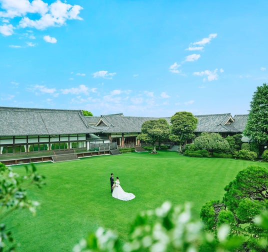 約1,000坪の広さを誇る庭園は段差一つない壮観な眺めが特長。ほとんどの披露宴会場から庭園を眺められる。