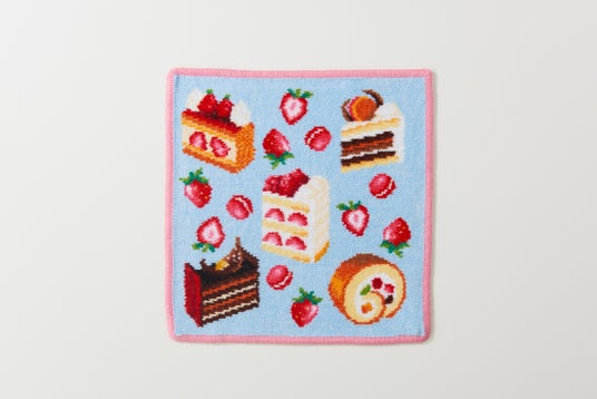 ハンカチのデザインは全部で2種類。1つは、今が旬のいちごを使用したスイーツをはじめ、「パティスリーSATSUKI」で人気の高い5種のスイーツを織り込みました。いちごやマカロンのデザインも施され、見た目の華やかさと可愛らしさが溢れる1枚に。