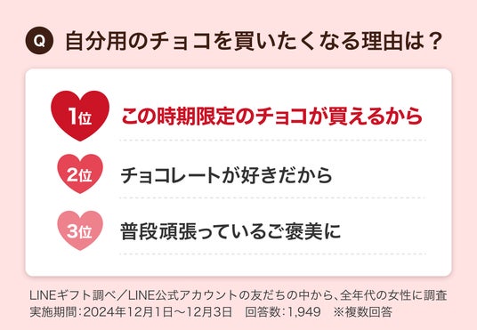 自分チョコを購入する理由の1位は、「この時期限定のチョコレートが買えるから」で、今しか食べられない限定のフレーバーや、バレンタインならではの華やかなパッケージなどが今年も注目を集めそうです。