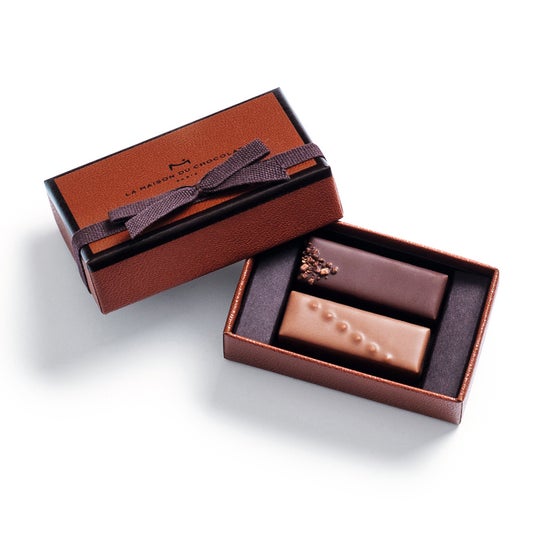 「ラ・メゾン・デュ・ショコラ」を代表する、ボンボン・ドゥ・ショコラの詰め合わせ。ガーナ産カカオの力強くスパイシーな味わいが特徴的なダークガナッシュ「アコソンボ」と、シンプルなミルクガナッシュ「シルビア」の2種を楽しめます。