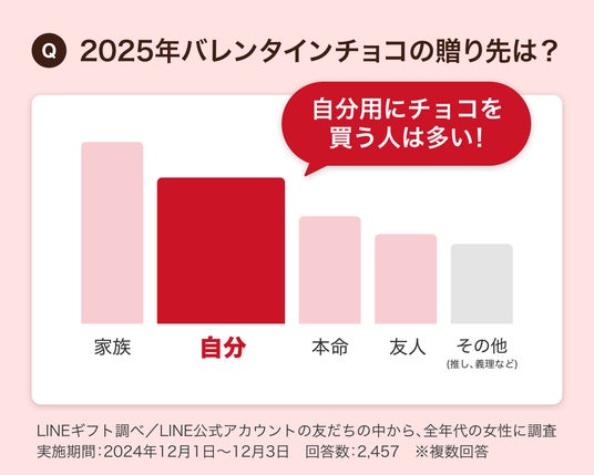 「LINEギフト」の「ご褒美チョコ特集」では、2月14日のバレンタインデーに先駆け、人気ブランドのチョコレートを多数掲載しています。「LINEギフト」のユーザーを対象に行った調査では、今年のバレンタインチョコレートの贈り先として、家族チョコに次いで「自分チョコ」が2位にランクインし本命チョコを上回る結果になるなど、自分用チョコレートの需要が高いことがうかがえます。
