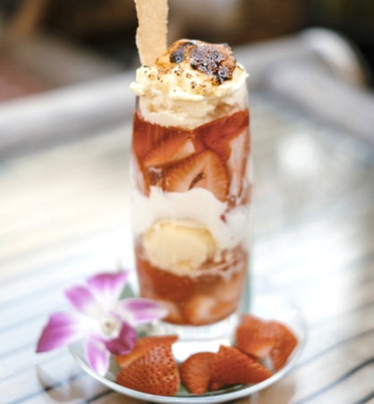 苺と相性の良いチーズクリームをブリュレにした香ばしさから始まり、下に進むとフレッシュな苺や苺ゼリーが楽しめます。途中、ブラッドオレンジのアイスクリームやコーンフレークたちが、味や食感に変化をもたらし、最後はバリ料理店ならではの果物、ライチのゼリーで爽やかな味わいに。