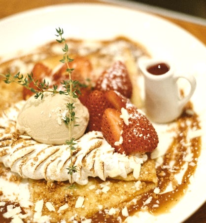 酸味と甘みのバランスが良いと、苺好きからの人気が高い和歌山県産“まりひめ”を使用。その苺と相性の良い、紅茶のアイスクリームやアールグレイ風味のキャラメルソース、ホワイトチョコレートなどをふんだんにあしらった贅沢クレープです。別添えのラズベリーソースをフレッシュ苺にひとかけすると、さらに特別感がアップ。