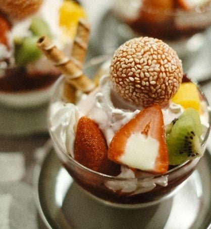 お料理は、第一印象も大事だと考えているので、苺の美味しさに加えて、可愛さや豪華さをどう演出しようか考えました。そびえたつ揚げ春巻きの皮に、クリームやアイスをつけて召し上がってください。