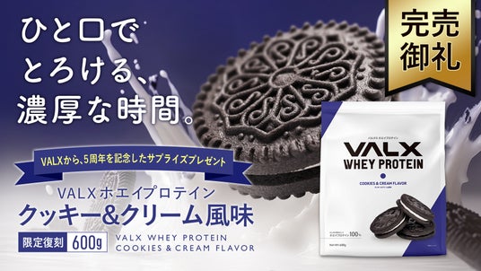 フィットネスブランド「VALX(バルクス)」を展開する株式会社レバレッジ(本社:東京都渋谷区、代表取締役:只石昌幸、以下レバレッジ)は、2024年12月10日(火)より販売をしておりました限定復刻フレーバー「VALX ホエイプロテイン クッキー&クリーム風味」のVALXメンバーズストア取り扱い分が完売したことをお知らせいたします。
