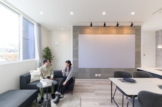『天井高最強』とは、限られた敷地の中で居心地の良い住宅について平面(平方メートル)ではなく、立体(立方メートル)で考えた時、たどり着いた答えのひとつが天井高です。リビングには高さ2.9m×横幅3.6mの大きい壁、PlusMeWall(プラスミーウォール)が御座います。存在感のあるこの壁を、どうデザインするかはお客様次第です。ノイズレスな空間に佇む強大な壁を、思いのままに活用してください。