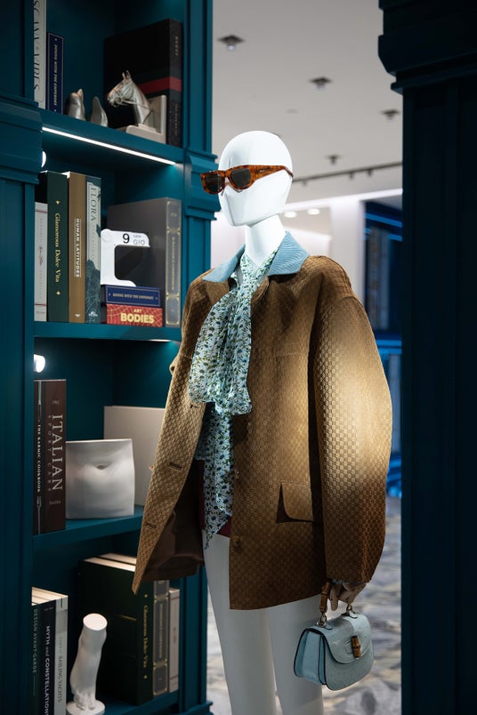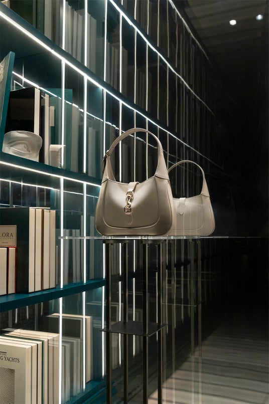 ウィンドウの中心には、光と鏡の途切れることのない相互作用によってどこまでも続いているように見える空間が生まれ、人々をさらに奥まで覗き込むように誘います。鏡張りのブックシェルフには、書籍や小さな彫像、グッチのアーカイブ モチーフを象ったブックエンドが美しく調和しながら並べられています。この入念にキュレーションされたウィンドウは、オブジェとその果てしなく続く反射を通じて、グッチのクリエイティブな宇宙を詩的に表現しています。