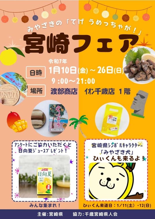 宮崎県は、宮崎県産品を販売・PRする「宮崎県ミニアンテナショップ」を北海道千歳市のイオン千歳店内にある「渡部商店」に、期間限定で設置いたします。