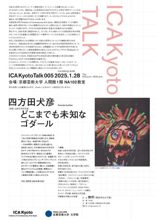 京都と世界のさまざまなアート・シーンを繋ぐ大学院付置機関、ICA Kyotoは、世界で活躍するアーティストや研究者を招いたトークイベントを行っています。来る1月28日(火)には、昨年11月に大著『ゴダール、ジャン=リュック』を刊行された映画・比較文学研究家の四方田犬彦氏をお招きし、スライドや映像を紹介しつつ、偉大な映画芸術家、ゴダールに迫る講演を行います。配信なし、対面のみの実施になります。ぜひご来場ください。