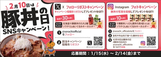 北海道のたれ屋として「十勝豚丼のたれ」を中心に調味料の製造・販売をしている株式会社ソラチ(本社:北海道芦別市、代表取締役:桑原朗)は、2月10日の豚丼の日に向けて豪華景品が当たるSNSキャンペーンを1月15日より開催いたします。