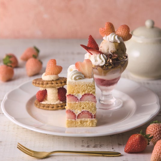 そのほか、店舗限定で登場するのは、酸味が少なく甘さが際立つ「とちあいか」、甘みと酸味のバランスがよい「あまおう」、つやのある鮮やかな紅色で甘味が強く甘酸っぱい「紅ほっぺ」の3種の苺を贅沢に使用した店舗限定パフェも登場します。