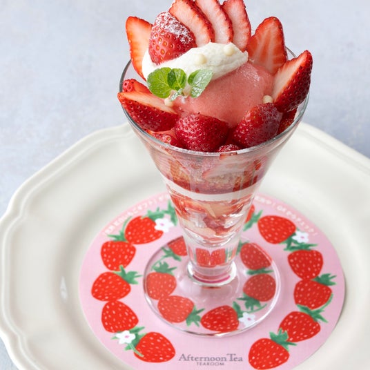 イラストレーター網中いづるさんが描く可愛い苺のイラストをあしらったオリジナルのデザインペーパーを、苺パフェに添えてご提供します。この時期だけの苺感が溢れるティータイムをお楽しみください。