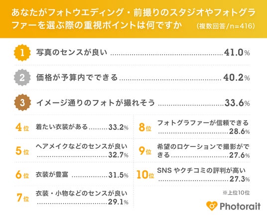 また、3位以下の項目は数値が拮抗しており、「着たい衣装がある(33.2%)」「ヘアメイクなどのセンスが良い(32.7%)」「衣装が豊富(31.5%)」といった、衣装やヘアメイクに関する要素が目立っています。個性やスタイルをより反映したフォトウエディングを求める傾向が強まっていることも考えられます。