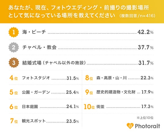 また、2025年1月~12月に結婚予定で、フォトウエディング・前撮りを実施予定の18~49歳の416名を対象に「フォトウエディング・前撮り撮影に関する調査」を実施。その結果とPhotoraitでの検索動向や投稿されたクチコミ傾向を併せて、2025年のトレンド予測をご紹介します。