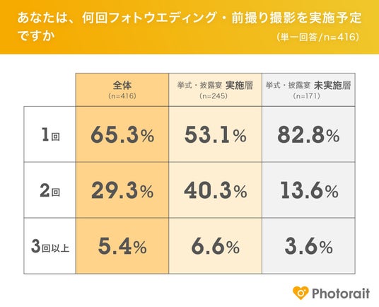 フォトウエディング・前撮りを何回撮影予定か聞いたところ、34.7%の方が複数回の撮影を予定していることがわかりました。特に挙式・披露宴実施層が複数回撮影する傾向が高い結果となりました。撮影場所や衣装の調査結果からも、衣装やロケーションのバリエーションを多く検討していることから、それぞれの希望を叶えるために撮影を複数回行う意向が高まっているとも考えられます。一度の撮影では収まりきらない思いを形にするため、場所や季節を変えて撮影をするフォトウエディングの楽しみ方が広がっていくことに期待できます。