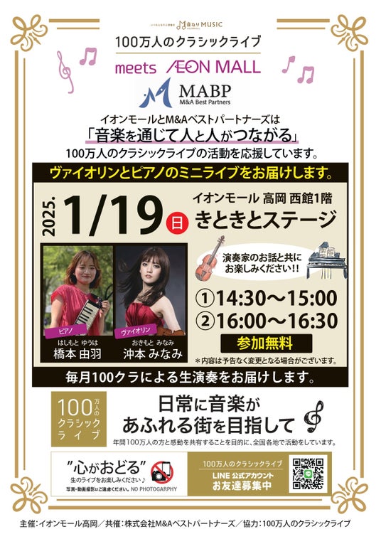 製造、建設、不動産、医療・ヘルスケア、物流、ITに特化したM&A仲介を行う株式会社M&Aベストパートナー(本社:東京都千代田区、代表取締役社長:齋藤 達雄 以下M&Aベストパートナーズ)と、一般財団法人100万人のクラシックライブ(東京都千代田区、代表理事:蓑田秀策 以下100万人のクラシックライブ)は、1月19日(日)14:30/16:00より、イオンモール高岡にて、クラシックライブを開催することをお知らせいたします。