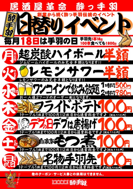 居酒屋革命 酔っ手羽 本厚木店の「日替りイベント」