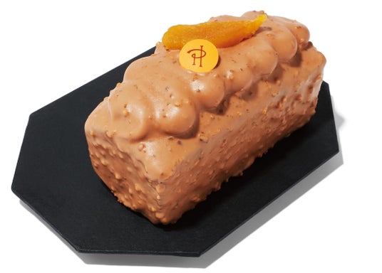 ほしいもピールパウダー入りパウンド生地に、ほしいものガナッシュをのせて、ほしいもピールフレークを混ぜ込んだチョコレートでコーティグ。濃厚な味わいの焼きいもを飾りました。さつまいもの風味と食感を楽しめる、豪華なケーキです。
