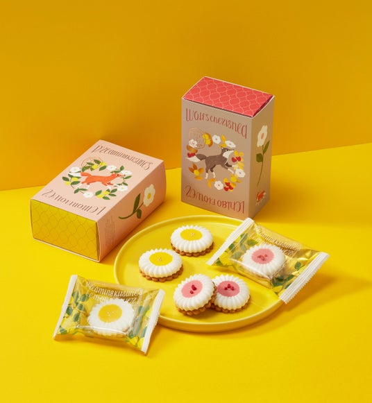 「キツネとレモン」 左)夢見るキツネのレモンフラワー(3個入)778円 右)オオカミの憧れイチゴフラワー(3個入)778円