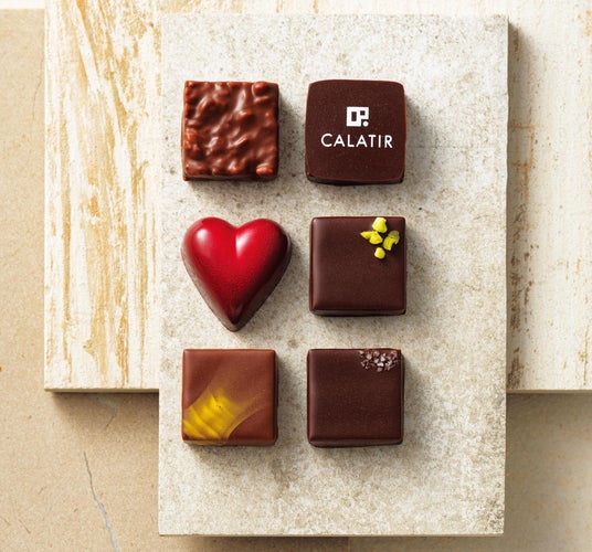 パティスリー<レタンプリュス>の熊谷氏が手がけるチョコレートブランド<カラティール>。自社でカカオ豆から作られたショコラや、ナッツのペーストやプラリネで作られた香りと風味の豊かなボンボンショコラのバラエティーに富んだ詰め合わせです。