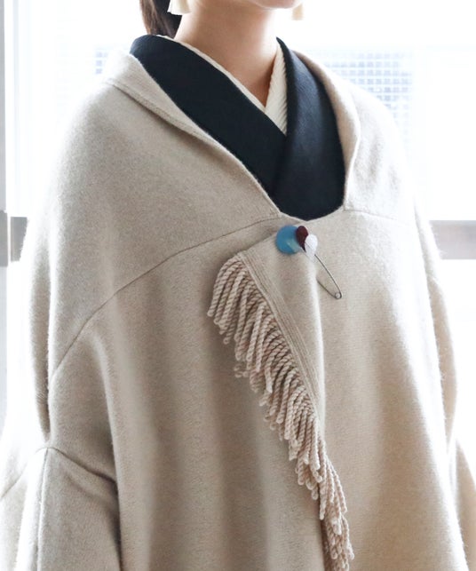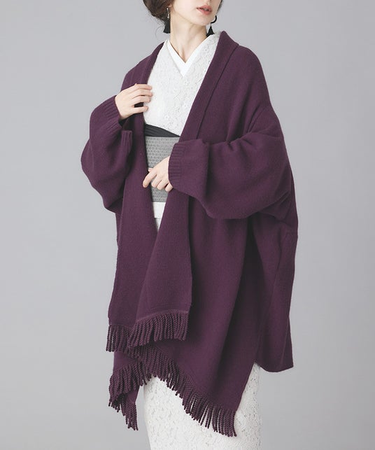 「フリンジショールニットコート」 ラムウールとホワイトカシミヤで作られた糸でしっかり感と軽さがあります。ショールの様に羽織って頂いたり、上下逆にして道行の様にもお使い頂けます(左上 オフホワイトの仕様)