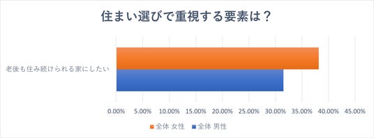 女性の38.17%が「老後も住み続けられる家」を重視しており、将来を見据えた住まいづくりでリードしていることが分かります。一方、男性も31.51%と、女性には及ばないものの、意外にも多くが老後の安心や安定を意識していることがわかりました。男性は現在の生活スタイルや利便性を優先する傾向がある中で、約3割が将来の暮らしを考えた住環境の重要性を認識しています。女性が未来志向で主導する一方、男性も徐々に同じ方向性を見据えている姿が、この結果から浮かび上がります。