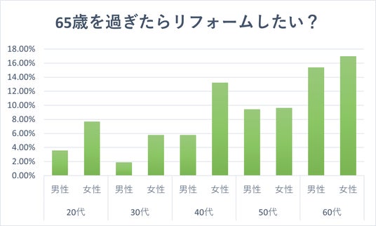 一方、男性のリフォーム意識は全般的に低く、特に若年層では「現状維持」を好む傾向が見られます。しかし、60代に差し掛かると急激に意識が高まり、多くの男性が老後の快適性や安全性の確保に目を向け始めます。この変化には、実際に高齢期を迎えてから住環境の重要性に気づく傾向が影響していると考えられます。