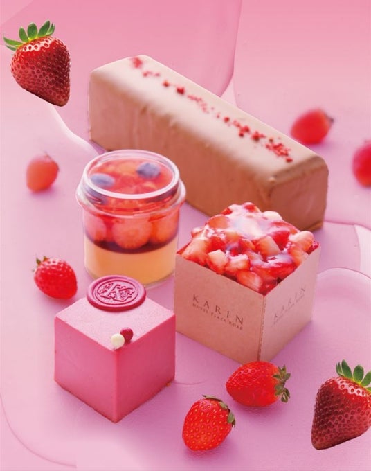 イチゴを使った様々なKARINのケーキやプリンが大集合。見た目はラグジュアリーで華やかでありながら、保存料や着色料、膨張剤などの添加物は一切不使用。オールナチュラルで手間を一切惜しまず、素材本来の風味や香りを大切にしたスイーツです。