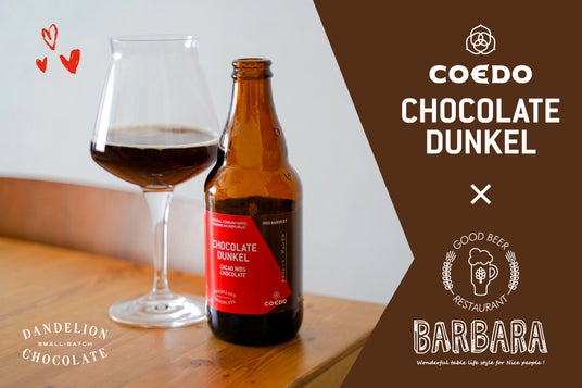 アメリカ・サンフランシスコ発の Bean to Bar チョコレート『ダンデライオン・チョコレート』と埼 玉・川越のクラフトブルワリー『COEDO』のコラボレーション。冬季限定商品として毎年販売させて いただいており、大変ご好評いただいております。 チョコレートを作る際に取り除かれるハスク=ニブの外皮をチョコレート・ニブと共に使用し、ベースとなるビアスタイル「デュンケル」にカカオの味わいを溶け込ませました。ドミニカ・ソリタリオ産カカオのチョコレートらしい香りと、デュンケルの持つ穏やかな飲み口をお楽しみください。手でグラスを包み込み、温度を上げながらゆっくり味わうのもおススメです。温度の上昇と共に、香りと味わいがひらいていきます。