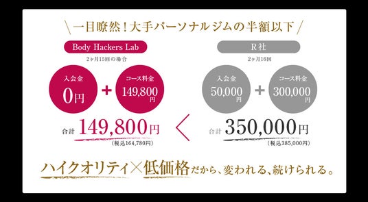 大手パーソナルジムでは2ヶ月30万円以上が相場ですが、ラボではその半額程度で「人生変える」体験を提供可能。