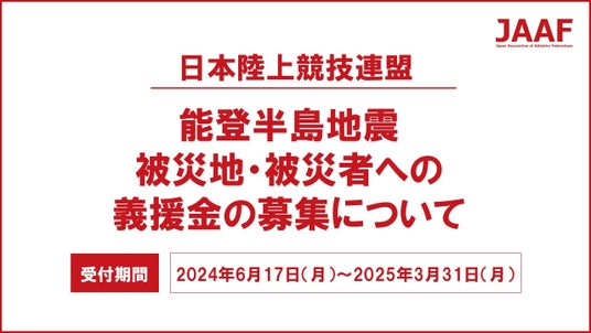 日本陸上競技連盟では、陸上界として被災地および被災された方々の支援、災害対応や復興のお役に立てるよう、本年1月23日~3月31日に実施した義援金の募集を再開いたします。