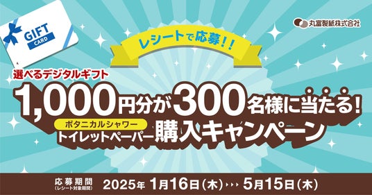2025年1月16日から2025年5月15日までの間に対象商品をご購入いただいたお客様を対象に、抽選で300名様に選べるデジタルギフト1,000円分をプレゼントいたします。