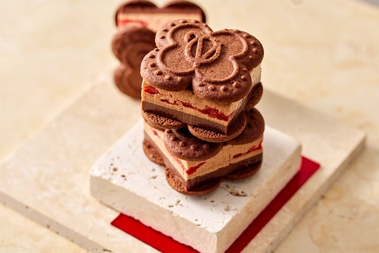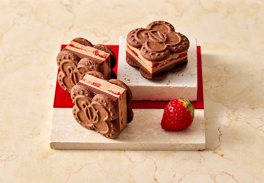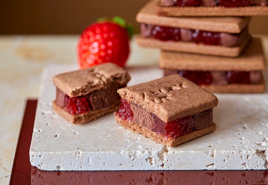 いちごと薫るショコラがとろっと溢れる、やわらか食感のカカオサンド。「イタリア産サブリナ苺」をとろっと煮詰めたコンフィチュールに、マダガスカル産カカオのカカオマスを練りこんだ芳醇ショコラ。ふたつが柔らかなまま合わさった“とろけるダブルメルト製法”の美味しさを、ココア風味のしっとりクッキーでサンドしました。