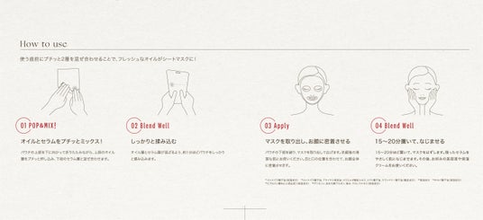5. 15~20分ほど置いて、マスクをはずします。残ったセラムをやさしく肌になじませます。その後、お好みの美容液や保湿クリームをお使いください。