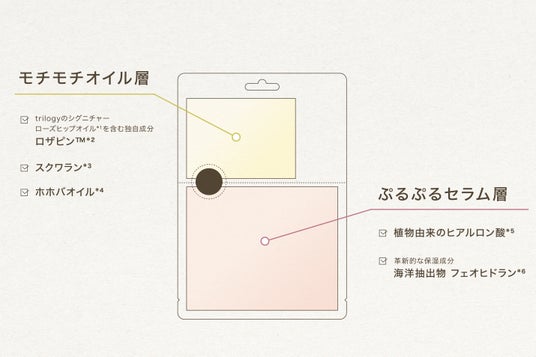 上部のオイル層は、trilogyのシグニチャーであるローズヒップオイル*⁵を含む独自成分「ロザピン(TM)*¹」と、スクワラン*⁶、ホホバオイル*⁷のトリプルオイルブレンド。